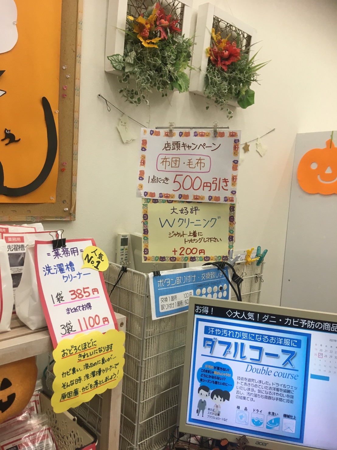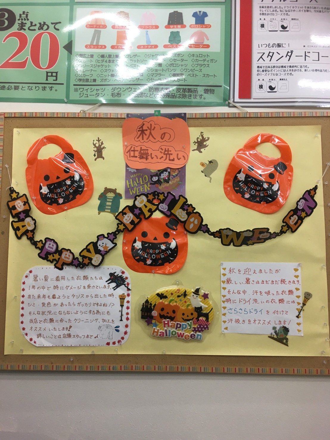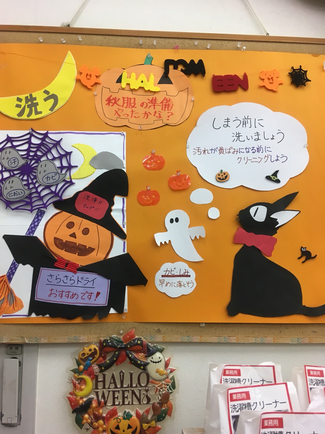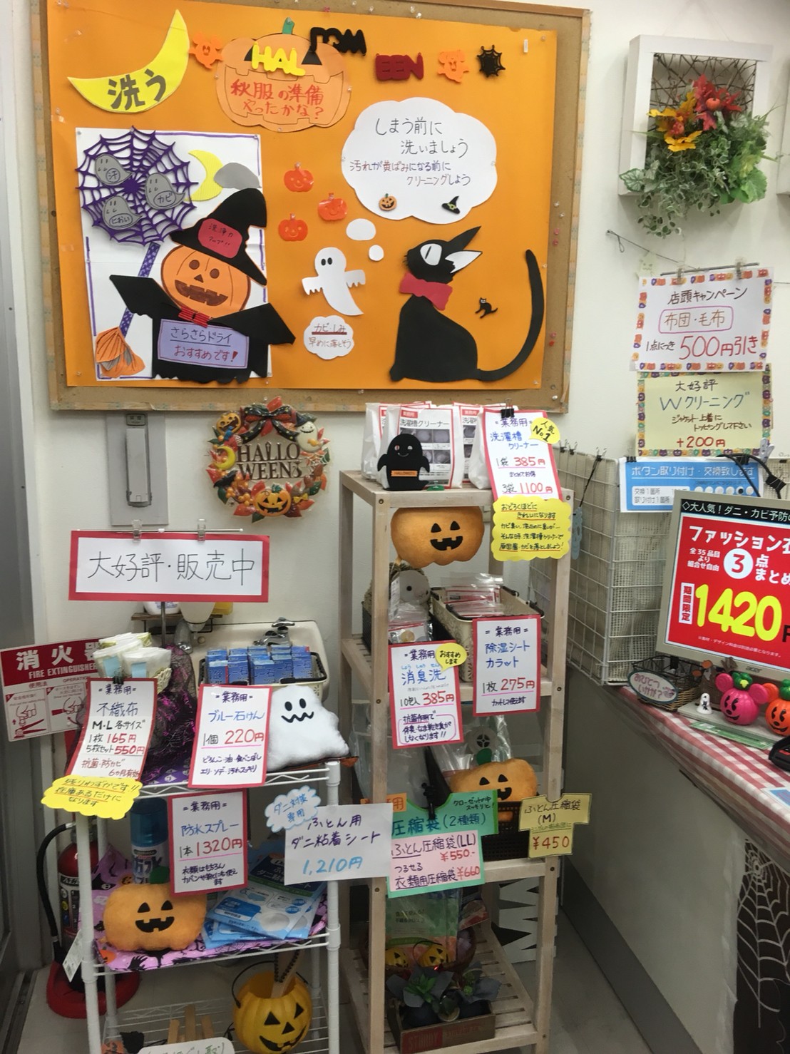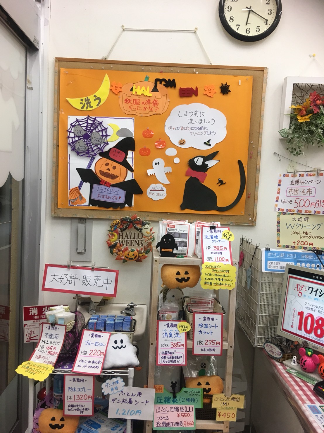茨城県神栖市・鹿島市、千葉県香取市・銚子市・旭市・山武郡横芝にあるスーパーに併設しているタニカワクリーニング各店では、毎年ハロウィンの時期に合わせて店内をハロウィン仕様に模様替えしております。