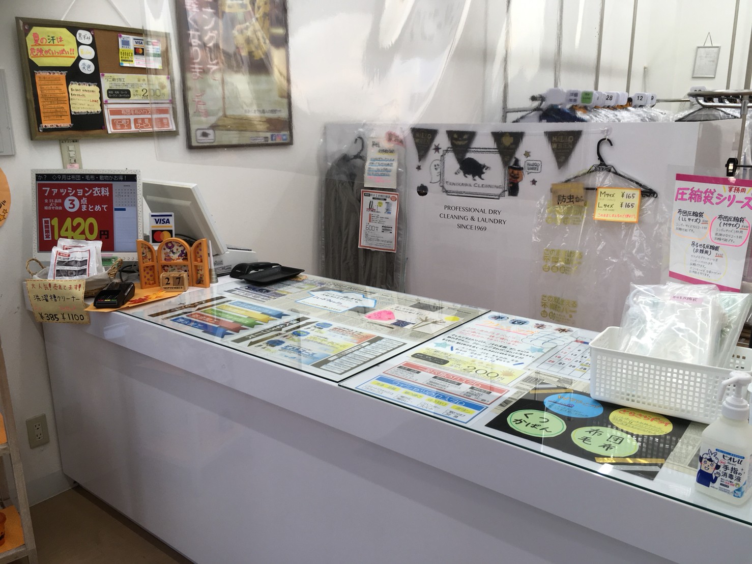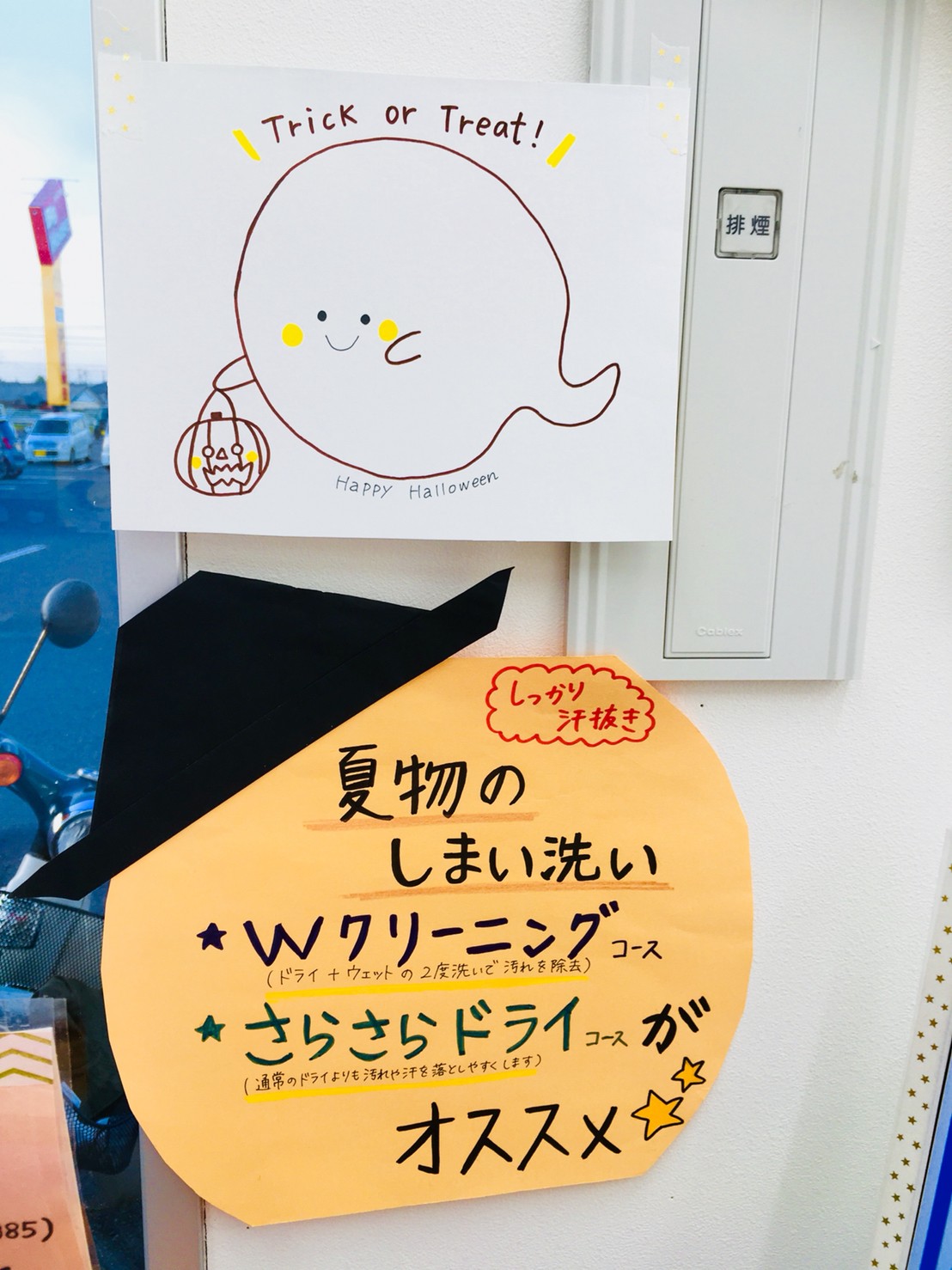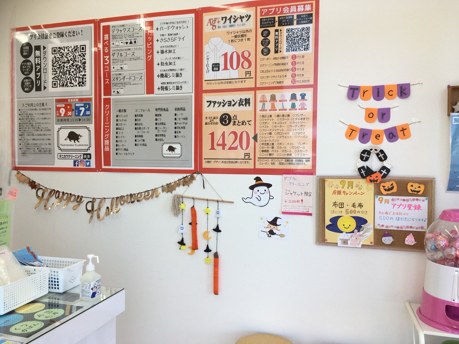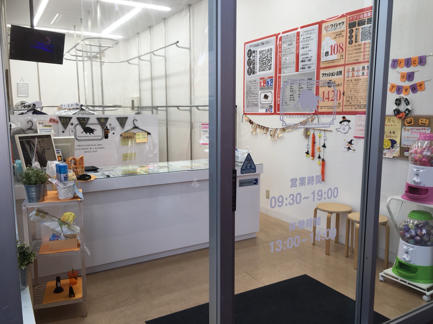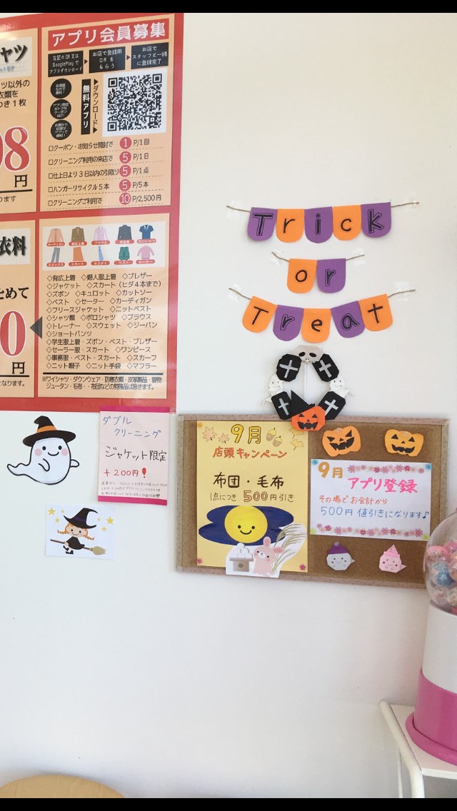 茨城県神栖市・鹿島市、千葉県香取市・銚子市・旭市・山武郡横芝にあるスーパーに併設しているタニカワクリーニング各店では、毎年ハロウィンの時期に合わせて店内をハロウィン仕様に模様替えしております。