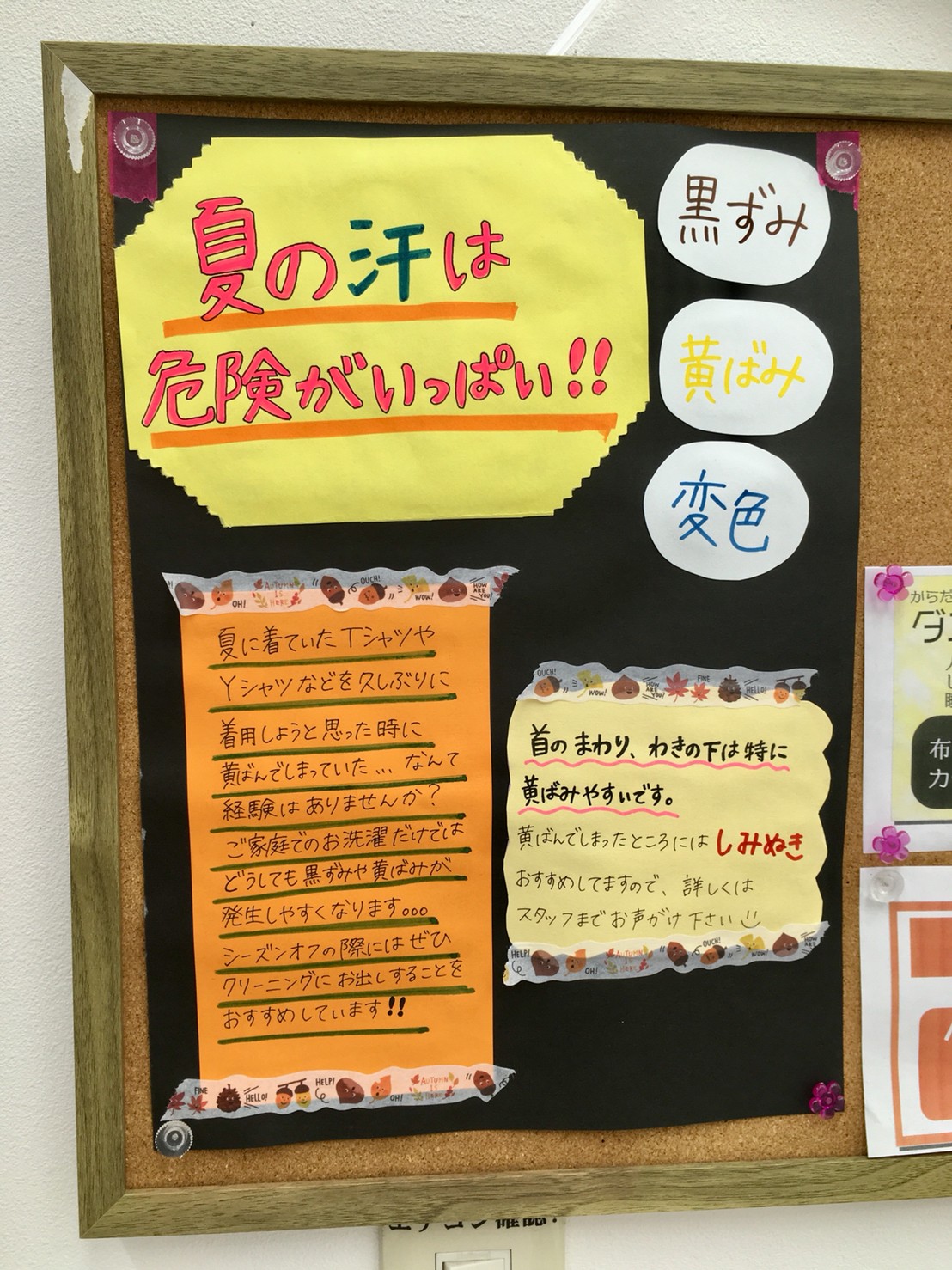 少し秋らしさが出てきました。お洋服も半袖姿をほとんど見なくなり、長袖やアウターを着用する姿を見かけるようになりました。服の色合いも流行はあるのでしょうが、夏の白っぽい感じからパステルカラーや淡い色合いが目立つ季節です。ところで、夏物衣類のクリーニングはお済みですか?