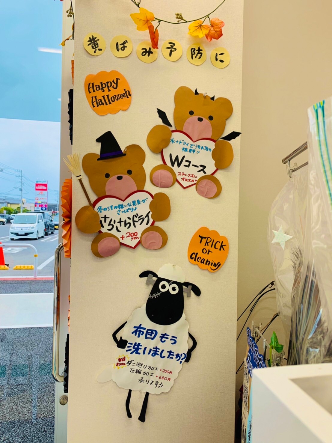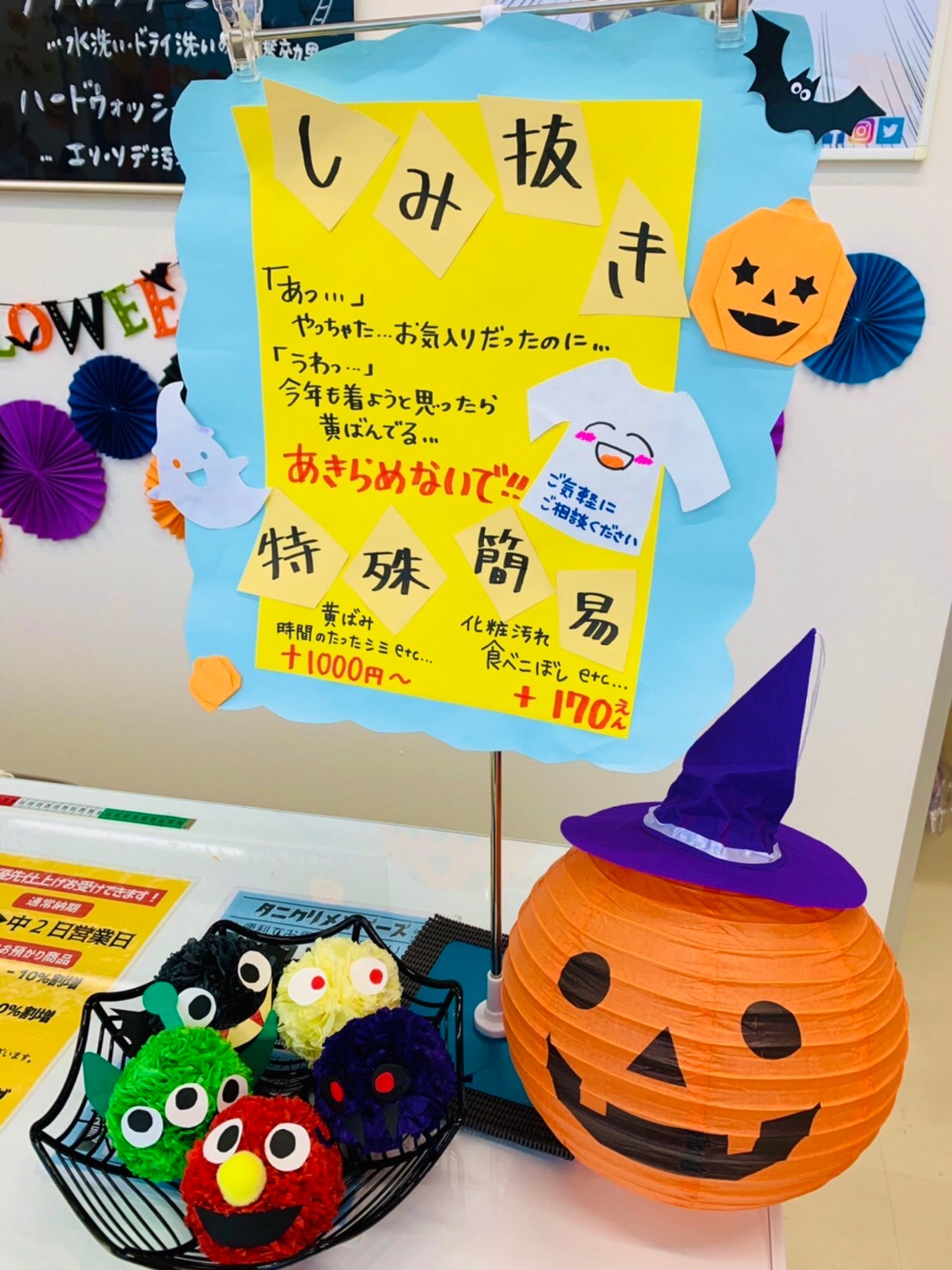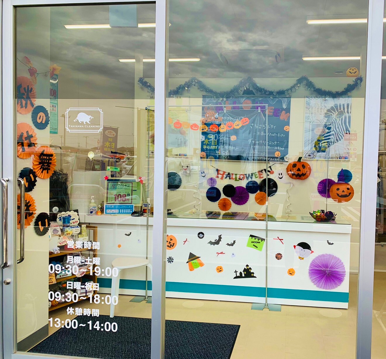 茨城県神栖市・鹿島市、千葉県香取市・銚子市・旭市・山武郡横芝にあるスーパーに併設しているタニカワクリーニング各店では、毎年ハロウィンの時期に合わせて店内をハロウィン仕様に模様替えしております。