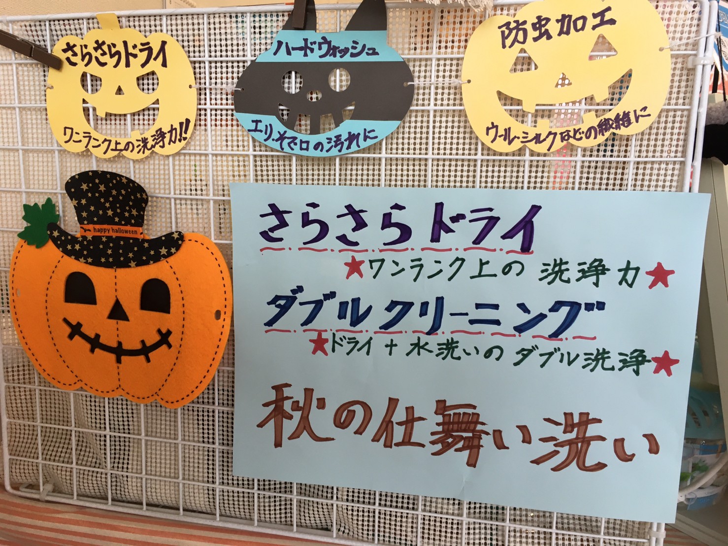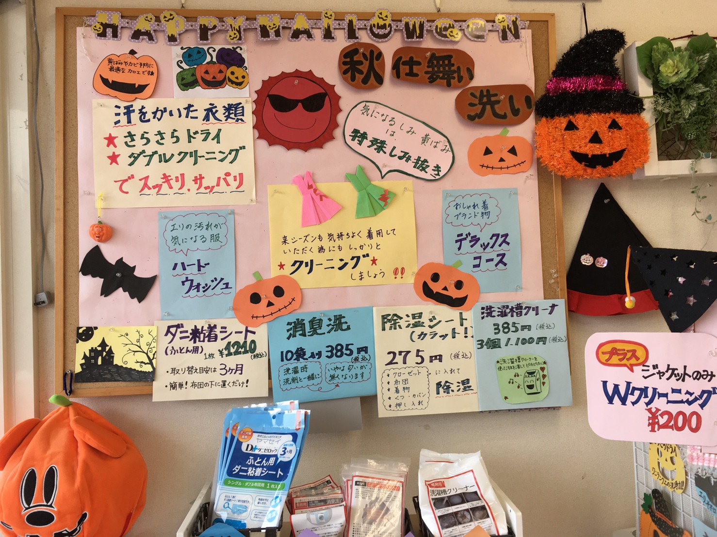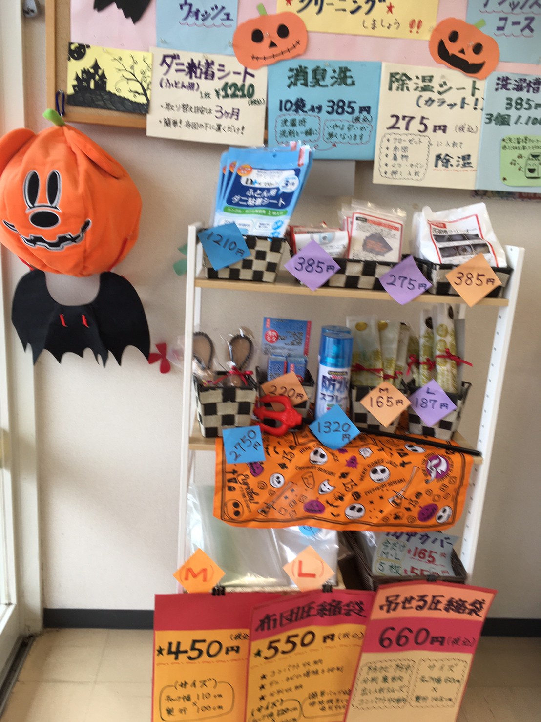 茨城県神栖市・鹿島市、千葉県香取市・銚子市・旭市・山武郡横芝にあるスーパーに併設しているタニカワクリーニング各店では、毎年ハロウィンの時期に合わせて店内をハロウィン仕様に模様替えしております。