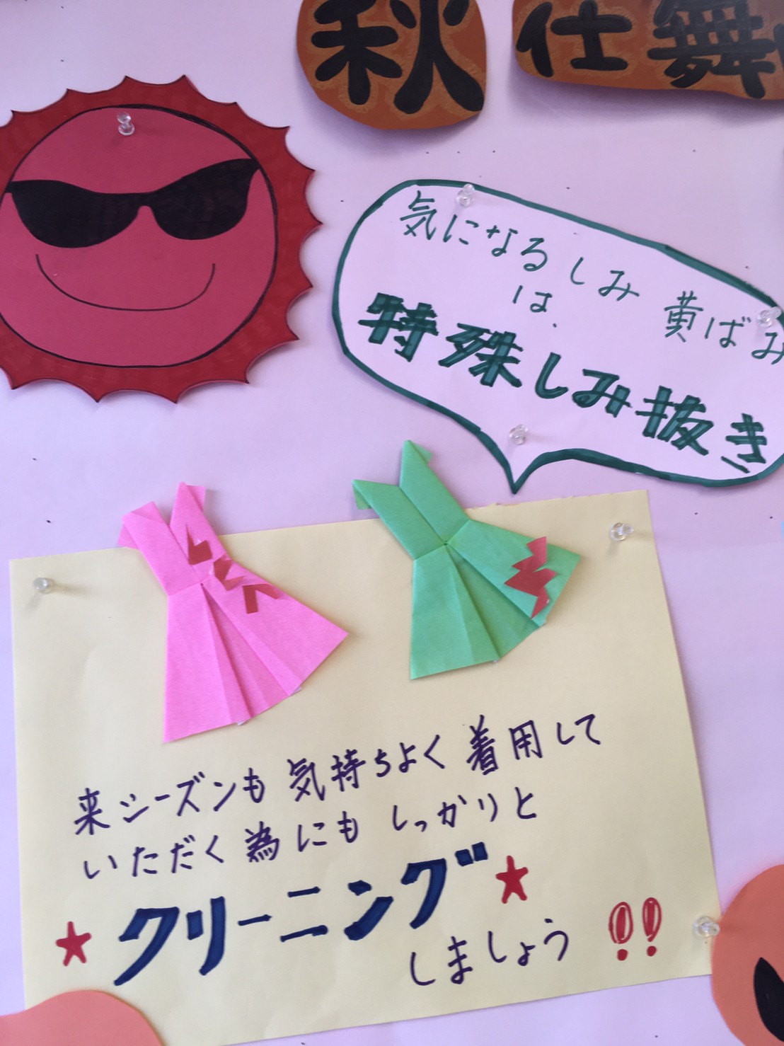 少し秋らしさが出てきました。お洋服も半袖姿をほとんど見なくなり、長袖やアウターを着用する姿を見かけるようになりました。服の色合いも流行はあるのでしょうが、夏の白っぽい感じからパステルカラーや淡い色合いが目立つ季節です。ところで、夏物衣類のクリーニングはお済みですか?