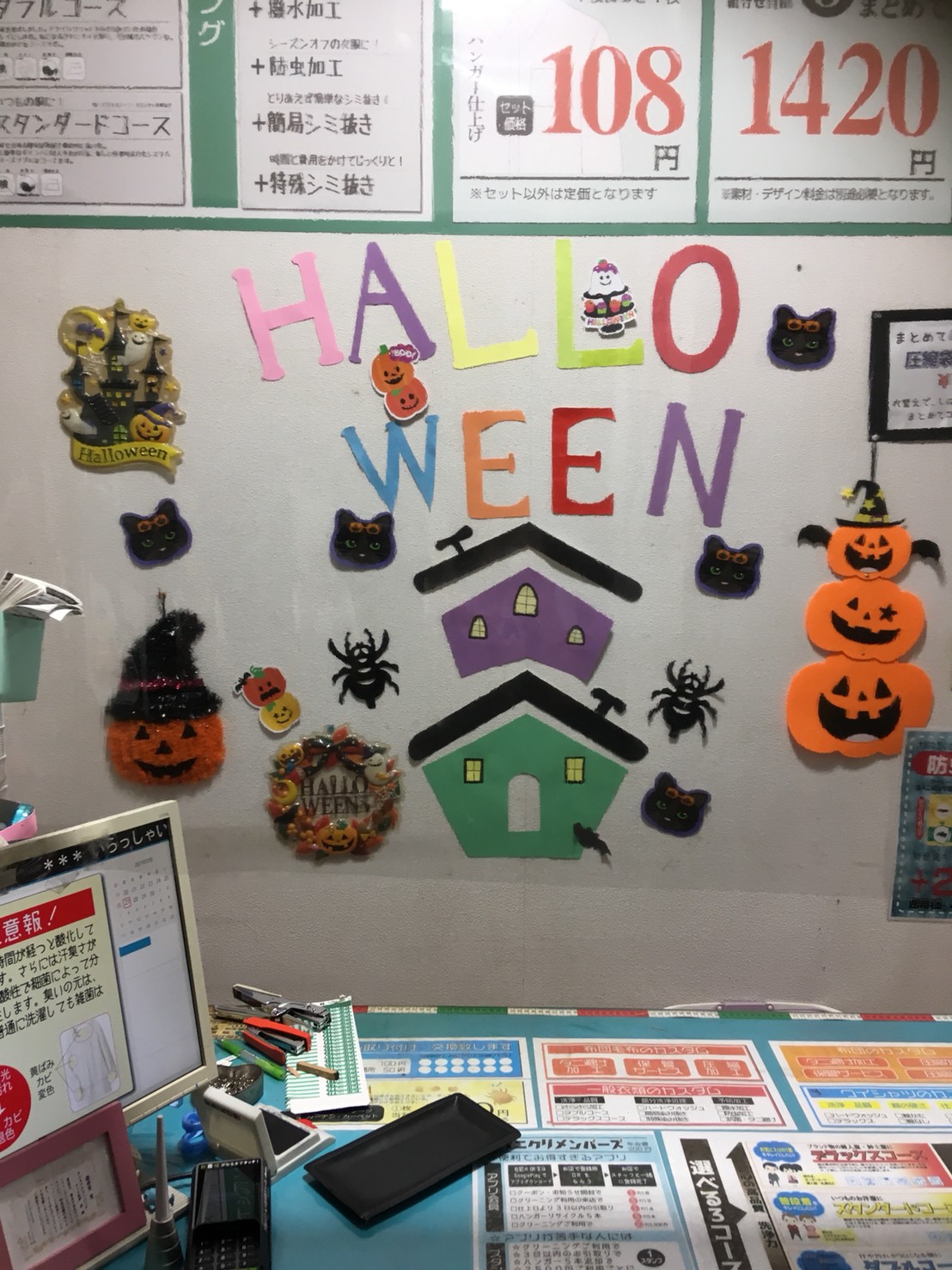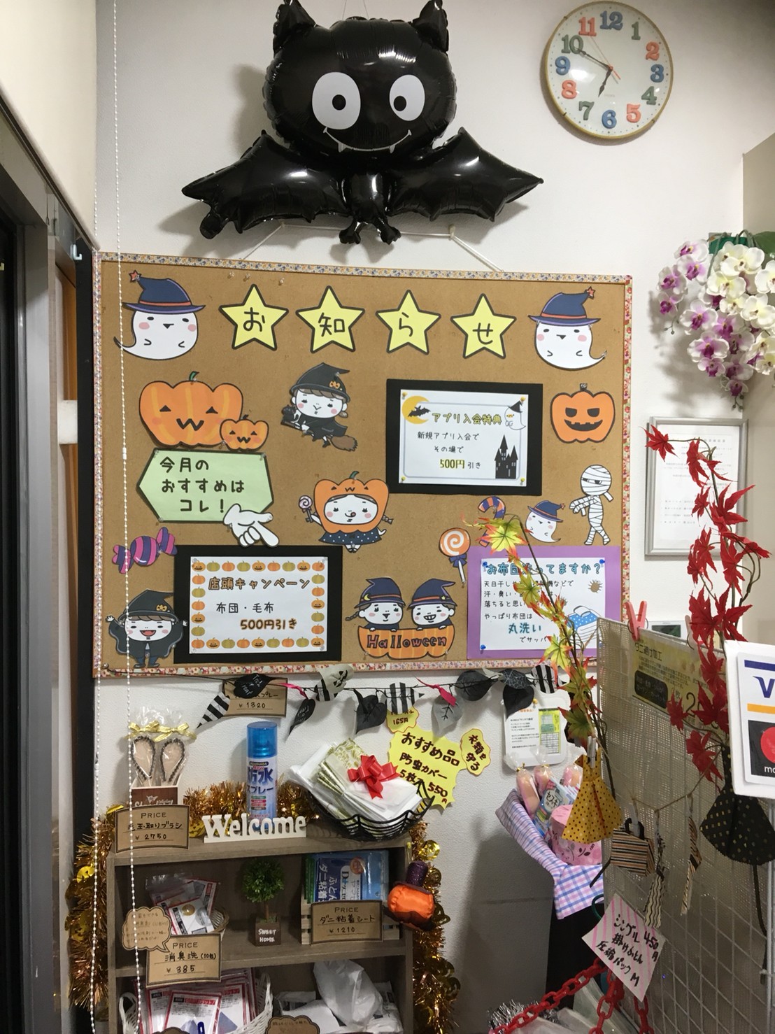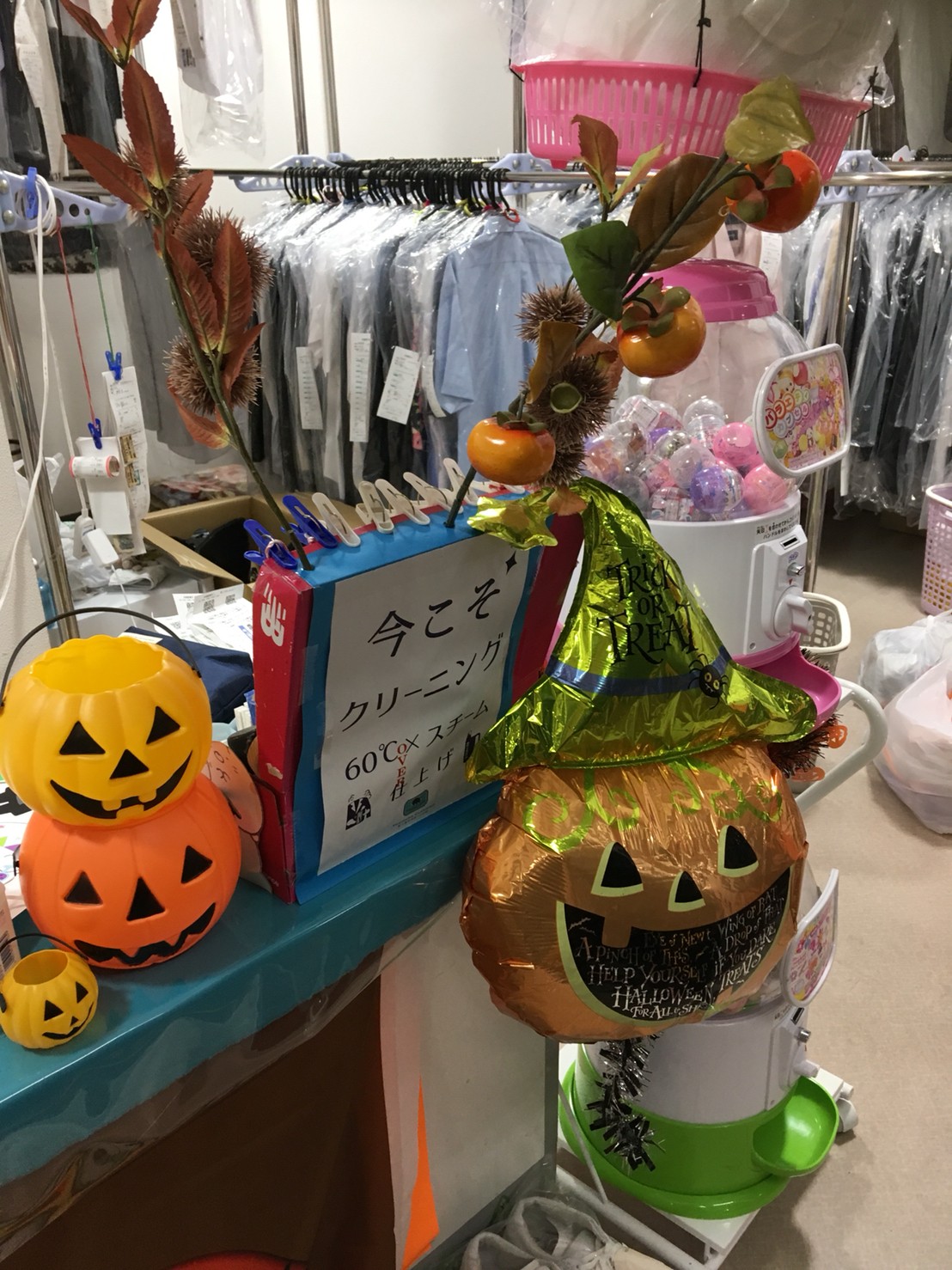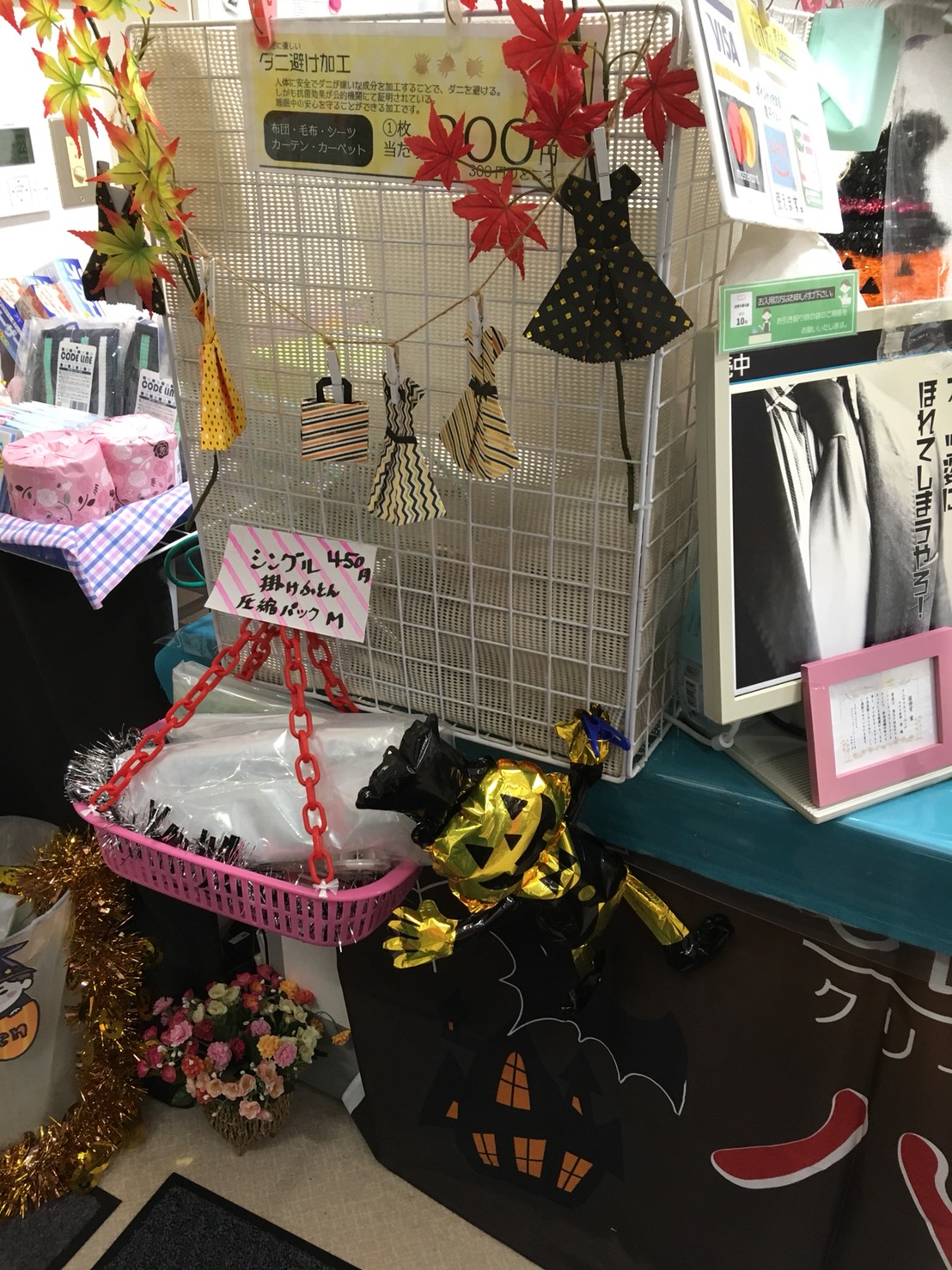 茨城県神栖市・鹿島市、千葉県香取市・銚子市・旭市・山武郡横芝にあるスーパーに併設しているタニカワクリーニング各店では、毎年ハロウィンの時期に合わせて店内をハロウィン仕様に模様替えしております。